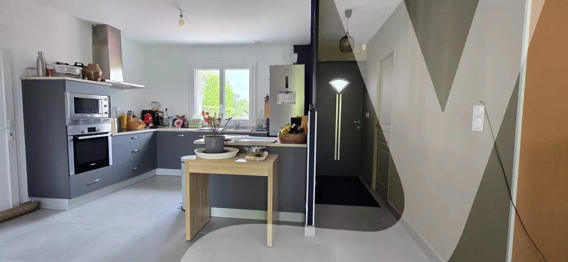 Pièce de vie traversante avec cuisine ouverte, moderne et équipée